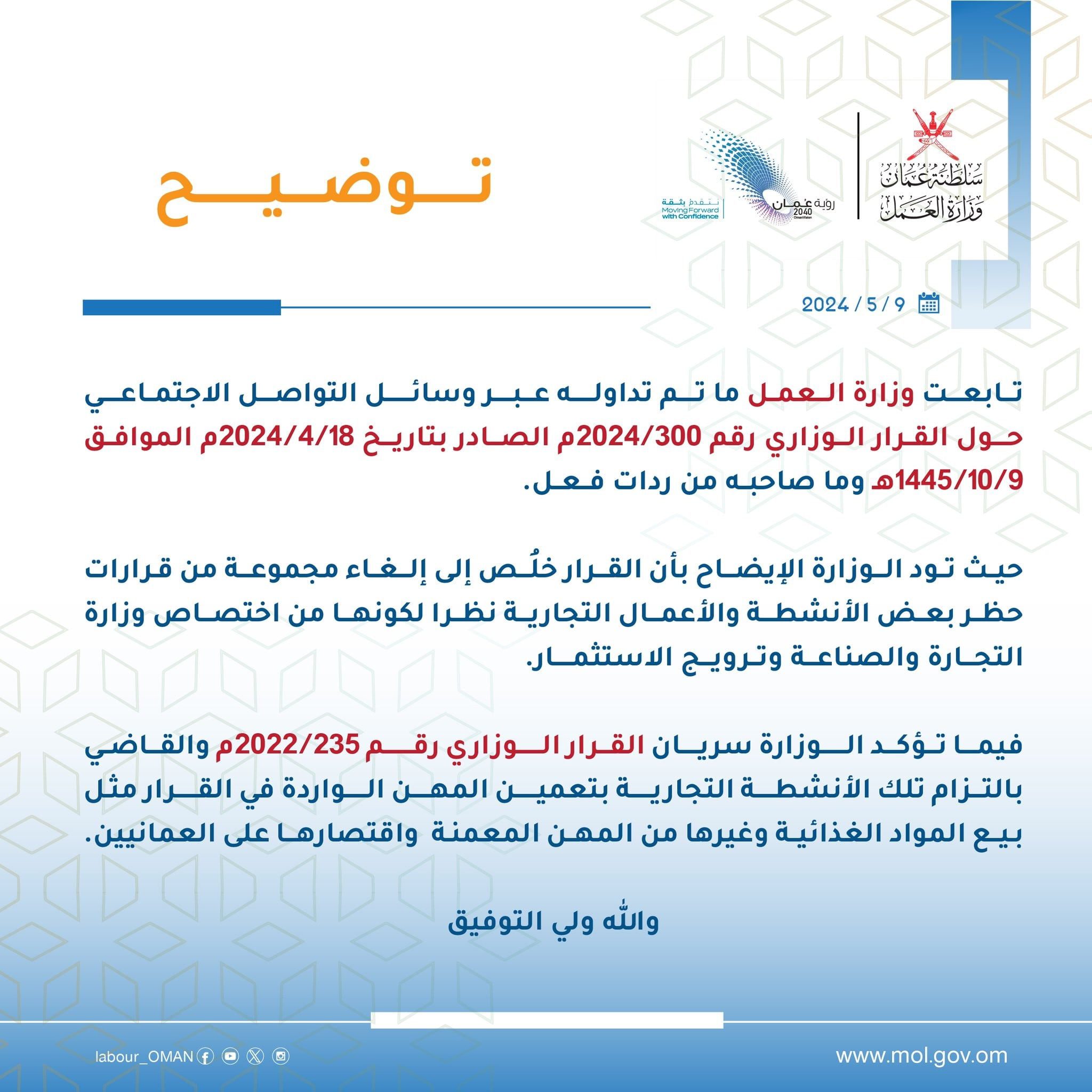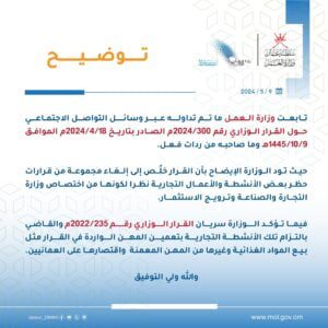 أصدرت وزارة العمل بيانا حول ما تم تداوله عبر وسائل التواصل الاجتماعي حول القرار الوزاري رقم 2024/300م
